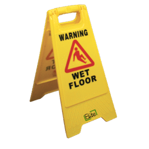 High-visibility yellow “Caution Wet Floor” sign — foldable, A-frame design with easy-grip handle, ideal for alerting pedestrians to slip hazards in commercial and public spaces.